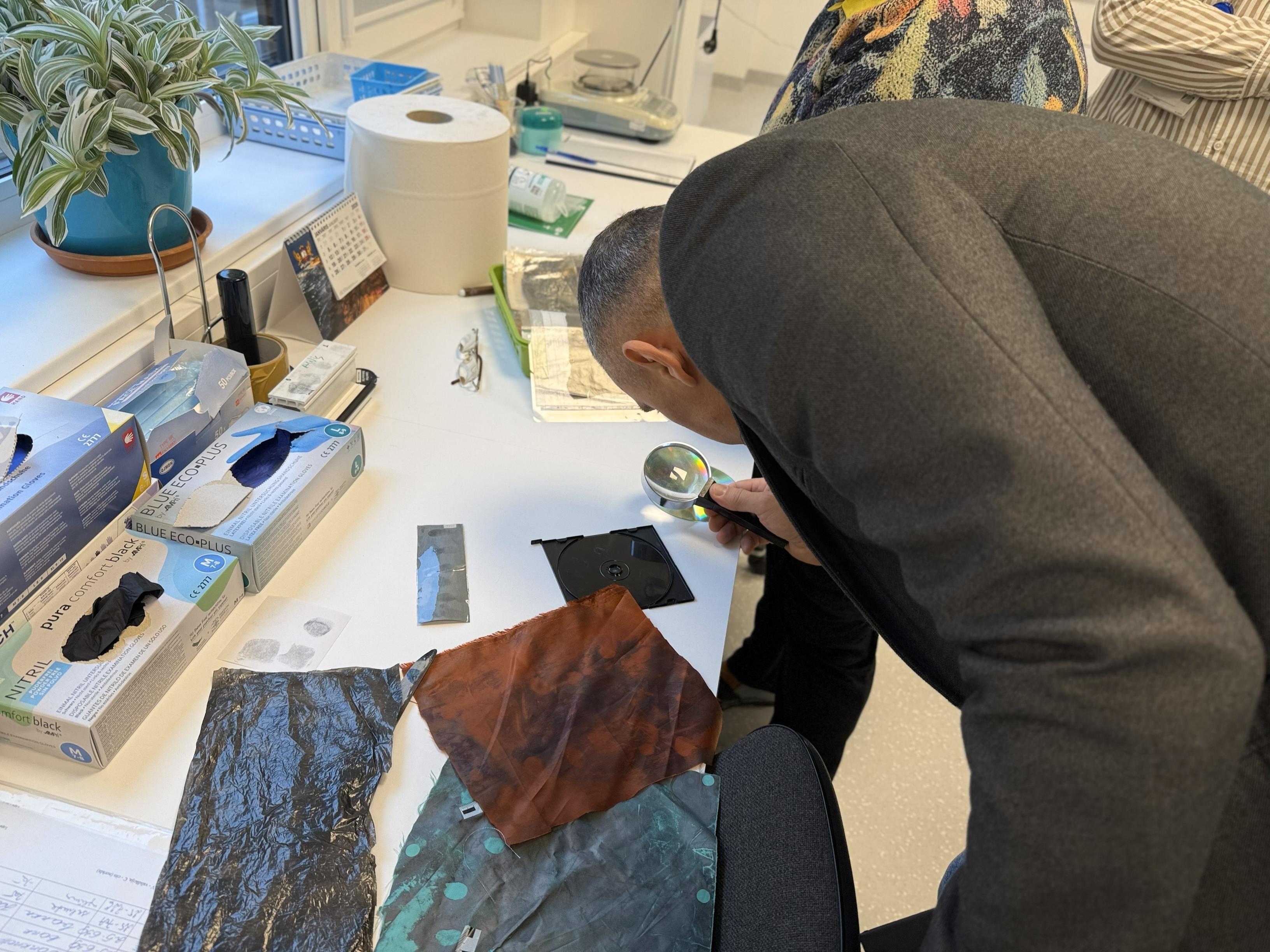 A participant of the specialized forensics training course examining items for fingerprints in Riga, Latvia.